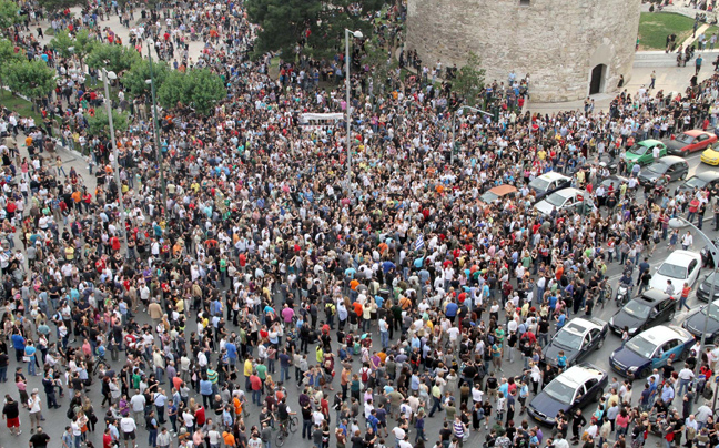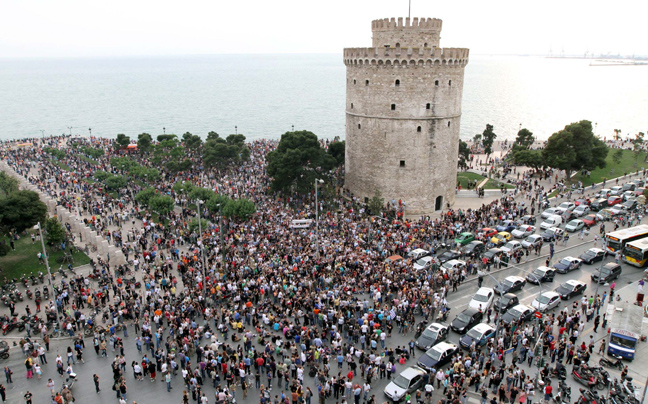 Κατά χιλιάδες συρρέουν οι «αγανακτισμένοι» στον Λευκό Πύργο με ξυπνητήρια καλώντας τους κατοίκους της πόλης με συνθήματα να «ξυπνήσουν» και να βγουν στους δρόμους. Πάνω από 5.000 άνθρωποι έχουν ήδη συγκεντρωθεί.