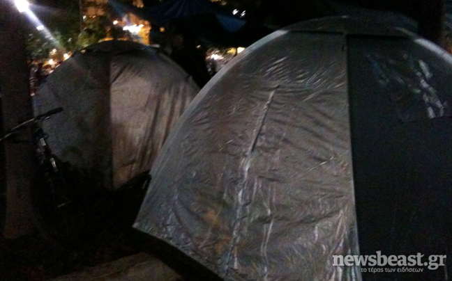 Τι κι αν ο καιρός δεν είναι με το μέρος τους; Οι αγανακτισμένοι πολίτες της Αθήνας είναι αποφασισμένοι να μείνουν στην πλατεία Συντάγματος όλη τη νύχτα. Για το λόγο αυτό αρκετοί από τους διαδηλωτές έχουν στήσει σκηνές.