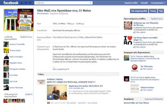 Τα 1.595 μέλη αριθμεί στο Facebook το γκρουπ των «Αγανακτισμένων» πανεπιστημιακών, οι οποίοι με πρωτοβουλία του πρύτανη του πανεπιστημίου Αθηνών καλούν σε ανοιχτή συγκέντρωση στις 19:00 στα Προπύλαια.