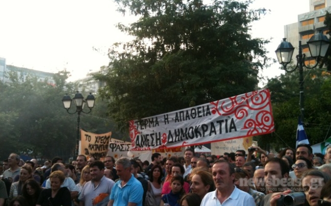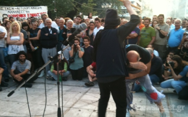 Σε εξέλιξη βρίσκεται το τελευταίο δεκάλεπτο παράσταση με τον Καραγκιόζη από θεατρική ομάδα στην πλατεία Συντάγματος την οποία παρακολουθεί πλήθος κόσμου, μεταξύ των οποίων, άντρες, γυναίκες και μικρά παιδιά. Αρκετοί είναι και αυτοί που κρατούν στα χέρια φωτογραφικές μηχανές για να απαθανατίσουν τις στιγμές αυτές.