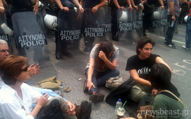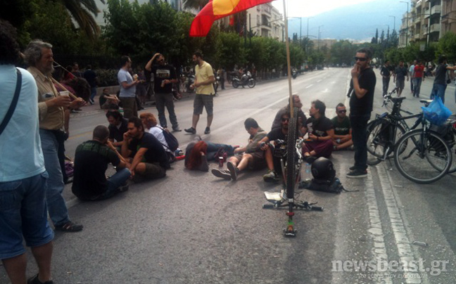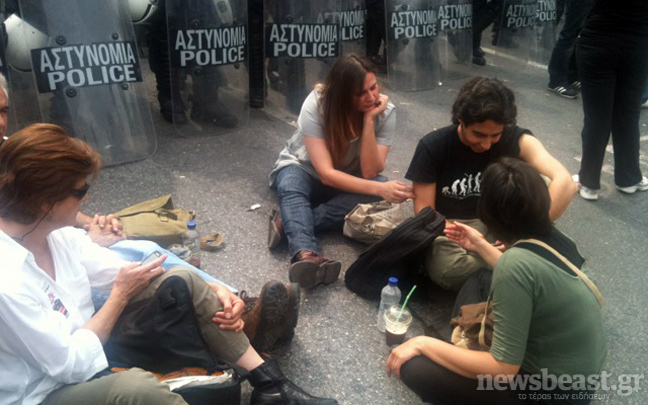 Στη συμβολή της λεωφόρου Βασιλίσσης Σοφίας με την Ηρώδου Αττικού, εκεί που βρίσκεται το Προεδρικό Μέγαρο και το Μέγαρο Μαξίμου, κάνουν αυτή την ώρα καθιστική διαμαρτυρία Αγανακτισμένοι διαδηλωτές.