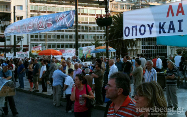 Εικοστή τέταρτη μέρα «αγανάκτησης» η σημερινή και αρκετός κόσμος, ανταποκρινόμενος στο αίτημα για συνέχιση των ειρηνικών κινητοποιήσεων ενάντια στο μνημόνιο και την οικονομική πολιτική της κυβέρνησης, βρίσκεται στην πλατεία Συντάγματος.