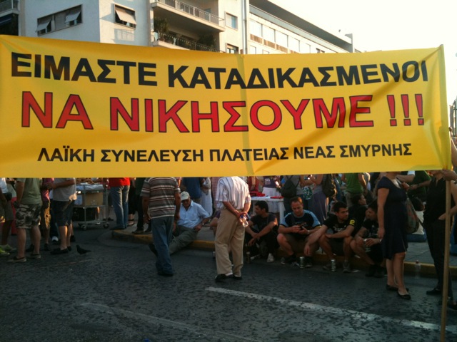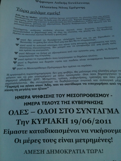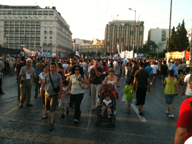 Ανεβαίνει όσο περνάει η ώρα η θερμοκρασία στην πλατεία Συντάγματος καθώς ο κόσμος πληθαίνει από λεπτό σε λεπτό. Οι Αγανακτισμένοι φωνάζουν συνθήματα όπως το «Κλείστε τις καντίνες σε κάθε παραλία αντί για μπάνιο φέτος θα πάμε στην πλατεία» και «πληρώσαμε τους φόρους δουλέψαμε πολύ, για χρέος δεν θα δώσουμε ούτε μια δραχμή».