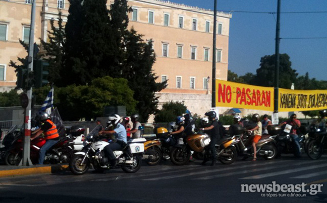 Λίγο μετά τις 6 το απόγευμα ομάδα περίπου 80 μοτοσικλετιστών από τη Λέσχη Μοτοσικλετιστών Ελλάδας πραγματοποίησε μηχανοκίνητη πορεία στο κέντρο. Όταν η πορεία βρέθηκε μπροστά από το κτίριο της Βουλής στη λεωφόρο Αμαλίας οι οδηγοί άρχισαν να κορνάρουν. Στη συνέχεια έστριψαν στη Βασ. Σοφίας και διαλύθηκαν.