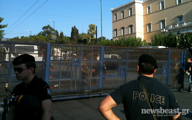 Πριν από λίγα λεπτά σημειώθηκε μικροένταση στο Σύνταγμα, επί της Βασ. Σοφίας, όταν μικρή ομάδα διαδηλωτών πλησίασε τις αστυνομικές δυνάμεις στο σημείο που έχει τοποθετηθεί ο φράχτης και τοποθέτησε μια ελληνική σημαία.