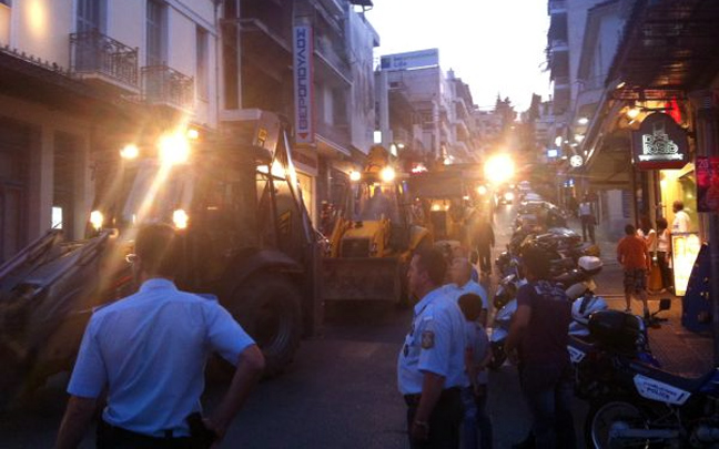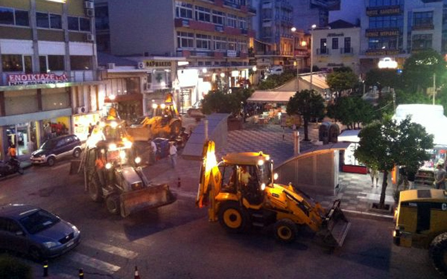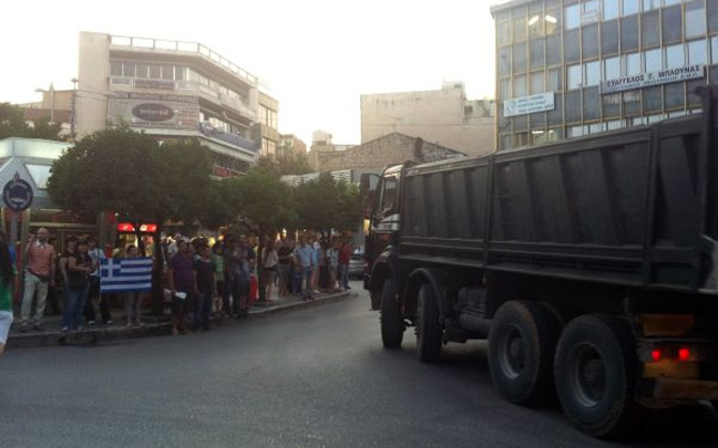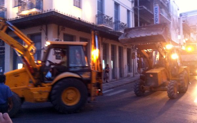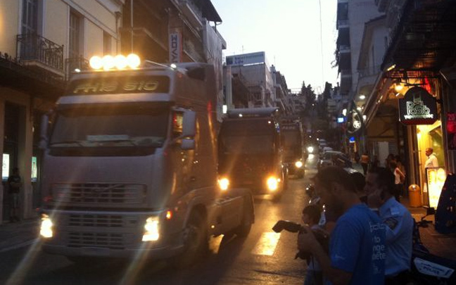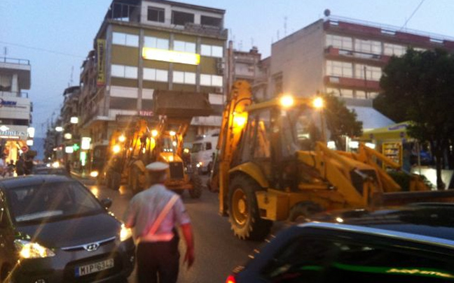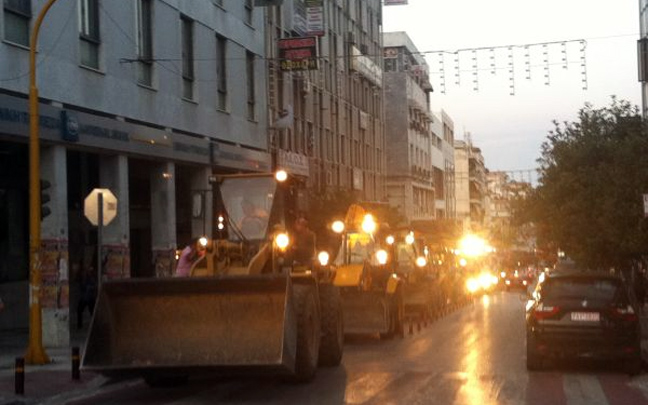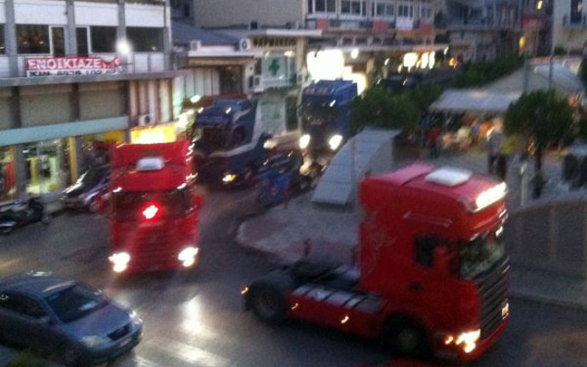 Ένα κομβόι με 50 περίπου οχήματα, μπουλντόζες, νταλίκες και φορτηγά, προκάλεσαν κυκλοφοριακό χάος, διασχίζοντας τις πλατείες και τους κεντρικούς δρόμους της πόλης. Οι αυτοκινητιστές κλείδωσαν τα βαριά οχήματα στην πλατεία Πάρκου και στην οδό Καποδιστρίου για περίπου μία ώρα.
