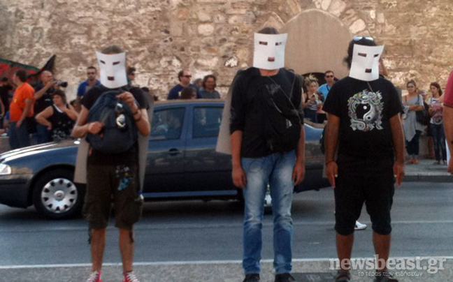 Φορώντας άσπρες, ανέκφραστες μάσκες διαδηλώνουν άνδρες, γυναίκες και παιδιά στο Λευκό Πύργο αυτή την ώρα.