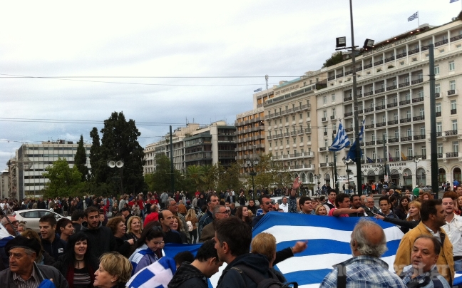 Ο κόσμος κρατάει πανό και ελληνικές σημαίες ενώ φωνάζει συνθήματα κατά της κυβερνητικής πολιτικής και των μέτρων λιτότητας.