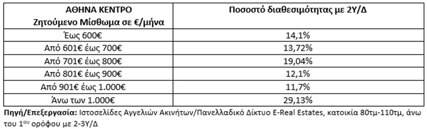Στις περιοχές του κέντρου της Αθήνας, το 72,18% (7 στα 10) των διαθέσιμων προς μίσθωση οικογενειακών κατοικιών (80-110 τμ, άνω του 1 ου ορόφου) έχουν ζητούμενο μίσθωμα άνω των 700 ευρώ/μήνα, εκ των οποίων το 29,13% (3 στα 10) άνω των 1.000 ευρώ/μήνα. Στο κέντρο της Αθήνας καταγράφεται αύξηση της διαθεσιμότητας ακινήτων στα υψηλότερα ζητούμενα μισθώματα, μόλις το 14,1% των διαθέσιμων προς μίσθωση ακινήτων, που είναι κατάλληλα για οικογένειες, έχουν ζητούμενο μίσθωμα έως 600 ευρώ στις περιοχές του κέντρου της Αθήνας.