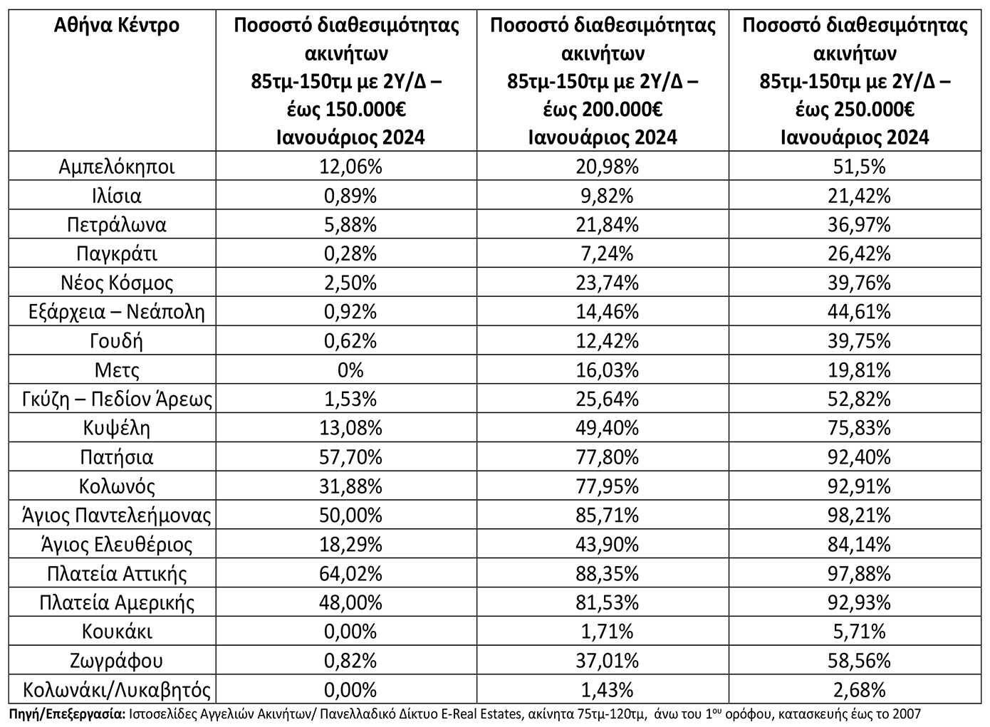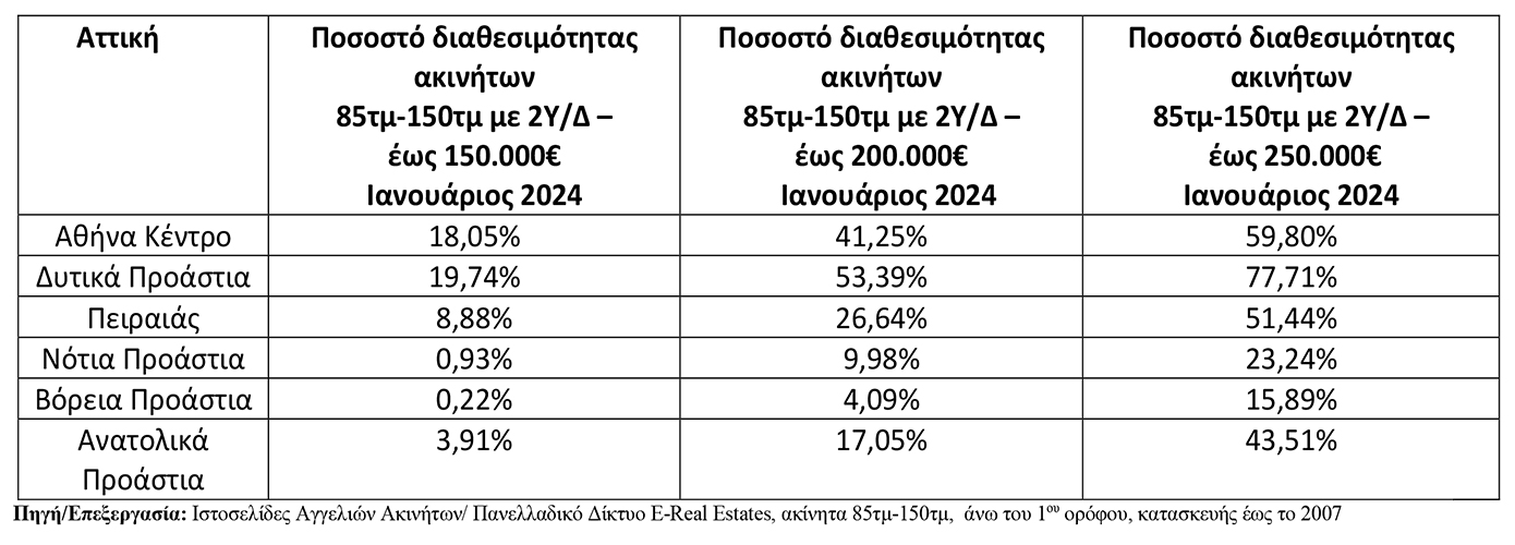 Σύμφωνα με τον κάτωθι πίνακα, η διαθεσιμότητα ακινήτων από 85τμ έως 150τμ άνω του 1ου ορόφου, με έτος κατασκευής έως το 2007 και ζητούμενη τιμή έως 150.000€, αγγίζει το 18,05% στις περιοχές του κέντρου, το 19,74% στα Δυτικά Προάστια και το 8,88% στον Πειραιά. Στις περιοχές των Νοτιών, Βορείων Προαστίων η διαθεσιμότητα είναι σχεδόν μηδενική, ενώ στις περιοχές των Ανατολικών Προαστίων μόλις στο 3,91%.