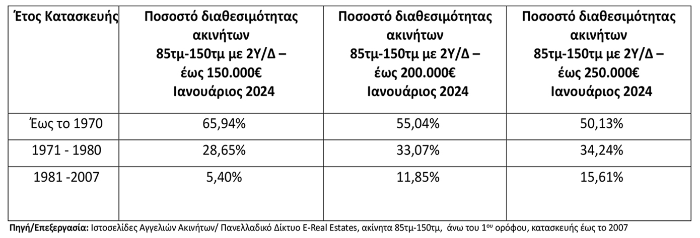 Εφόσον ο ενδιαφερόμενος βρει την κατοικία που πληροί τις προδιαγραφές του προγράμματος, θα πρέπει να γνωρίζει ότι το 84,37% των διαθέσιμων κατοικιών με ζητούμενη τιμή πώλησης έως 250.000€ είναι κατασκευής έως το 1980 – δηλαδή τουλάχιστον 44ετών σπίτια. Με ζητούμενη τιμή πώλησης έως 200.000€, το 88,11% και με ζητούμενη τιμή πώλησης έως 150.000€ το 94,59%.