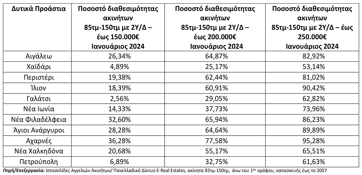 Με ζητούμενη τιμή πώλησης έως 200.000€, περιορισμένη διαθεσιμότητα καταγράφεται στο Χαϊδάρι (25,17%), στο Γαλάτσι (29,05%), στην Πετρούπολη (32,75%) και στην Νέα Ιωνία (37,73%).Όσον αφορά την διαθεσιμότητα κατοικιών με ζητούμενη τιμή πώλησης έως 150.000€, καταγράφεται σχεδόν μηδενική διαθεσιμότητα στο Χαϊδάρι, Γαλάτσι και Πετρούπολη.