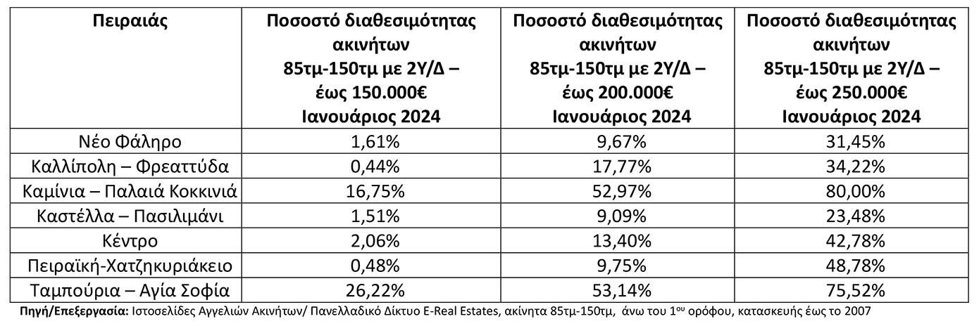 Σχεδόν μηδενική διαθεσιμότητα καταγράφεται σε Νέο Φάληρο, Καλλίπολη – Φρεαττύδα, Καστέλλα-Πασαλιμάνι,Κέντρο και Πειραϊκή Χατζηκυριάκειο για ακίνητα με ζητούμενη τιμή πώλησης έως 150.000€.