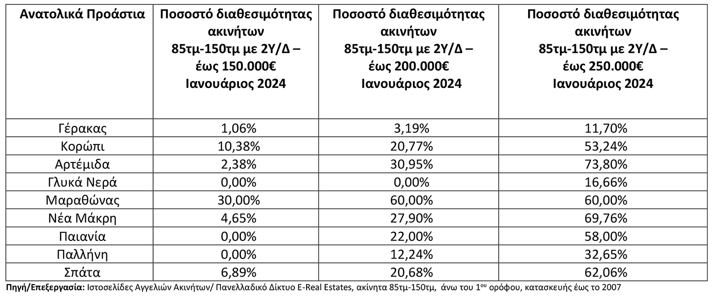 Περιοχές όπως η Νέα Μάκρη(69,76%), Αρτέμιδα (73,80%), Κορωπί (53,24%), Μαραθώνας (60%) και Σπάτα (62,06%) καταγράφουν υψηλή διαθεσιμότητα ακινήτων με ζητούμενη τιμή πώλησης έως 250.0000€. Περιορισμένη διαθεσιμότητα καταγράφεται στον Γέρακα (11,70%), Γλυκά Νερά (16,66%) και στη Παλλήνη (32,56%).