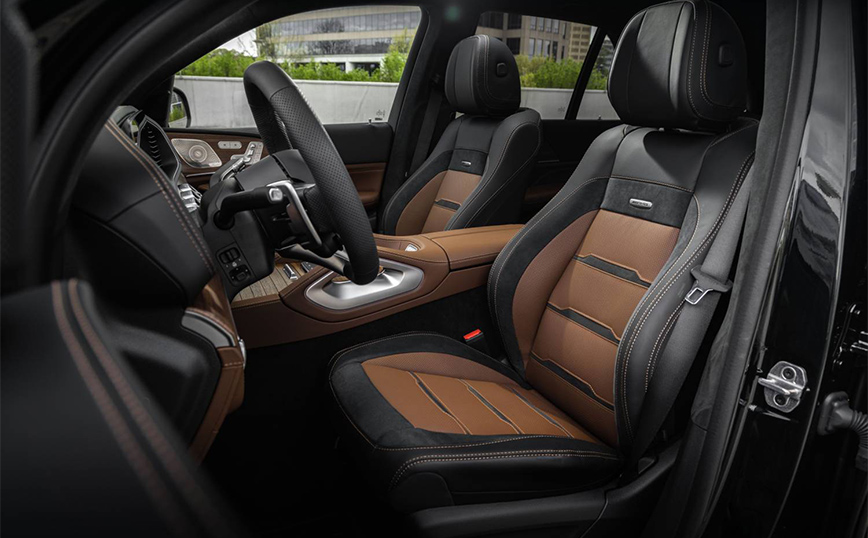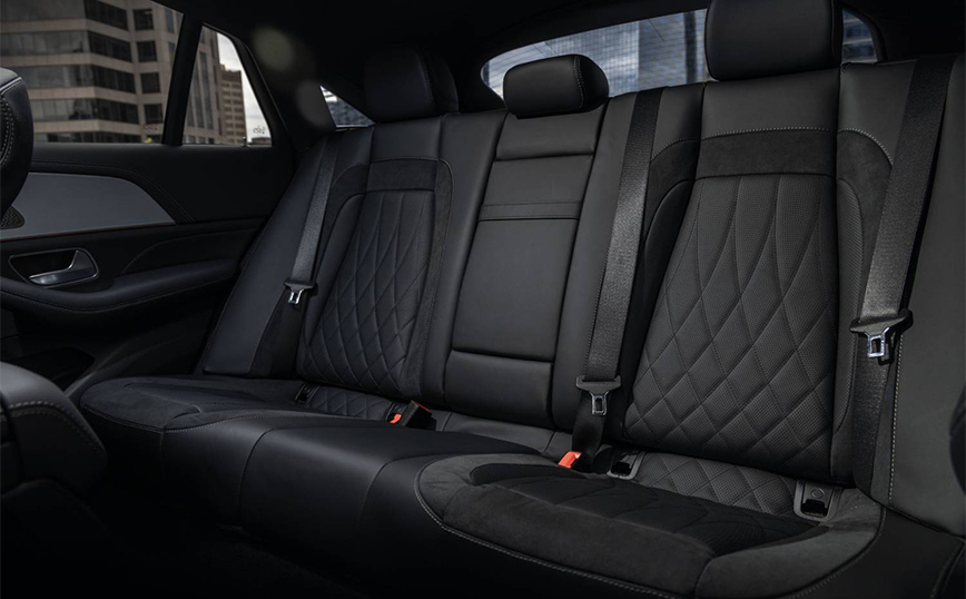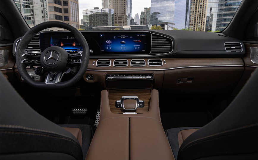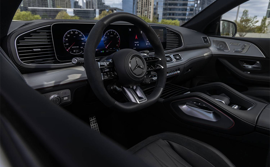 Στις GLE και GLE Coupé τοποθετείται το τιμόνι τελευταίας γενιάς με επιφάνειες αισθητήρων στις οριζόντιες ακτίνες. Με αυτά τα χειριστήρια αφής δεξιά και αριστερά, ο οδηγός μπορεί να χειρίζεται την οθόνη οδηγού και την κεντρική οθόνη από το τιμόνι. Ένα ιδιαίτερο χαρακτηριστικό στο εσωτερικό είναι οι κεντρικοί και πλευρικοί αεραγωγοί σε εμφάνιση χρωμίου, με γρίλιες από πραγματικό γαλβανισμένο μέταλλο. Επίσης, έχουν προστεθεί δύο νέα χρώματα εσωτερικού, ενώ οι επενδύσεις σε μαύρο/κλασικό κόκκινο, που διατίθενται αποκλειστικά για την έκδοση coupé σε συνδυασμό με τη σειρά AMG, είναι έντονα σπορτίφ. Ο διάκοσμος σε μαύρη λάκα «piano flowing lines Manufaktur» είναι πλέον διαθέσιμος για τις GLE SUV και GLE Coupé. Εάν επιλεγούν μαύρες επενδύσεις, τα καθίσματα διατίθενται σε δέρμα νάπα. Ο ατμοσφαιρικός φωτισμός προσφέρει τα ίδια χρώματα και τους ίδιους χρωματικούς συνδυασμούς με την S-Class. Δύο θύρες USB (προαιρετικός εξοπλισμός) που παρέχουν ισχύ 100 W είναι διαθέσιμες στο πίσω υποβραχιόνιο για πρακτική φόρτιση.