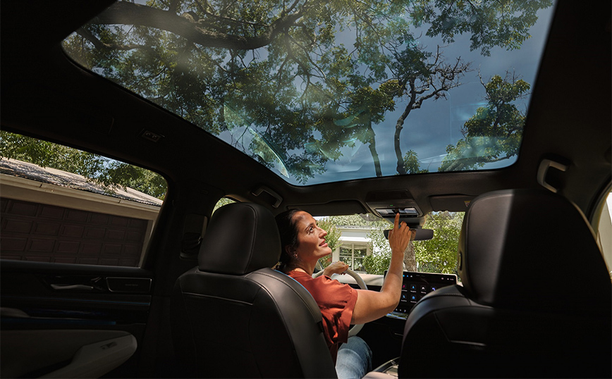 Η νέα πανοραμική ηλιοροφή διαθέτει και άνετο χειρισμό είτε με ένα πέρασμα του χεριού (swipe) ή μέσω φωνητικού ελέγχου, και ρυθμίζεται ώστε να είναι διαφανής ή μη. Η διαπερατότητα φωτός λειτουργεί μέσω ηλεκτροχρωματικής τάσης.