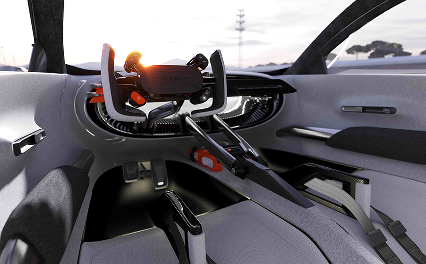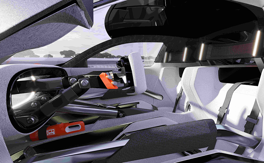 Ανάμεσα στους δύο επιβάτες, δύο μεταλλικοί δοκοί συγκρατούν την κεντρική κονσόλα στη θέση της και βιδώνονται στη «ράχη» του αυτοκινήτου που φαίνεται από το πάτωμα. Κάτω από τις δύο ράβδους στήριξης, είναι τοποθετημένος ένας πυροσβεστήρας. Το εσωτερικό είναι μια φουτουριστική ερμηνεία της γυμνής λειτουργικότητας ενός αγωνιστικού αυτοκινήτου, με μερικές μόνο οθόνες που εμφανίζουν βασικές πληροφορίες με ελάχιστους περισπασμούς οι οποίες παραπέμπουν στις ρυθμίσεις διαδικτυακών προσομοιωτών αγώνων.