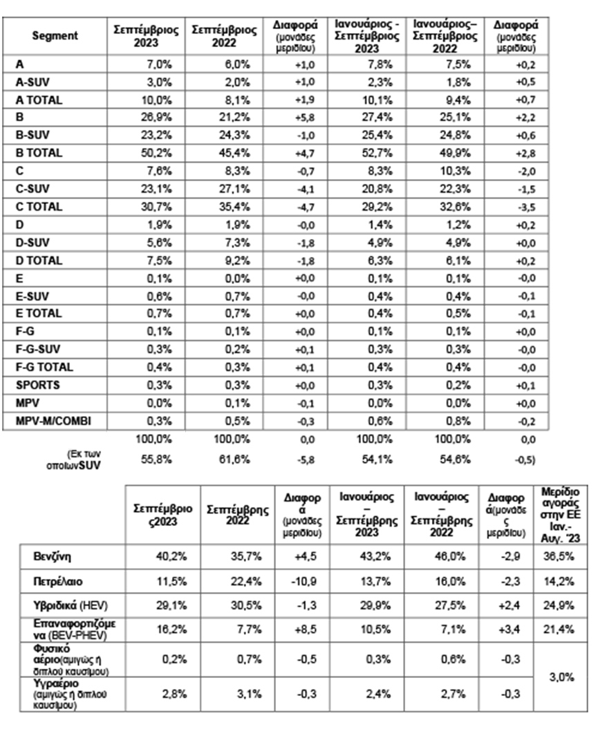 Πιο αναλυτικά και σύμφωνα με πρώτους υπολογισμούς, η πρόοδος στα segments επιβατικών και στην κατανομή ανά καύσιμο, ως το Σεπτέμβριο, έχει ως εξής: