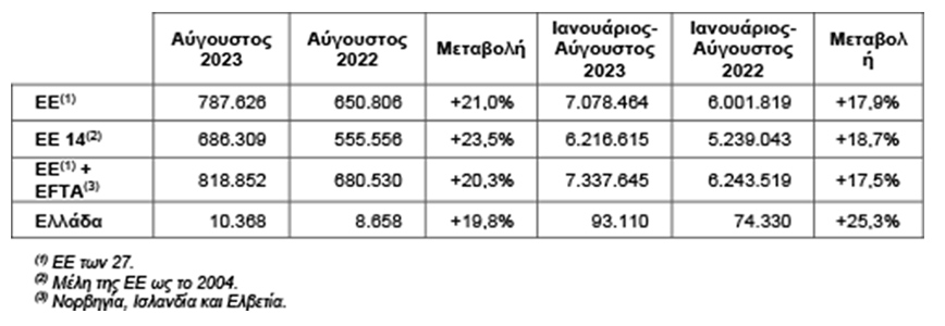 Τέλος, θεαματική είναι και η άνοδος των πωλήσεων σε επίπεδο ΕΕ, καθώς με βάση τα στοιχεία του Ευρωπαϊκού Συνδέσμου Κατασκευαστών Αυτοκινήτων (www.acea.be), η αγορά των επιβατικών κινήθηκε για τον Αύγουστο ως εξής: