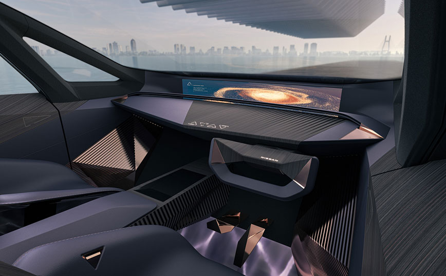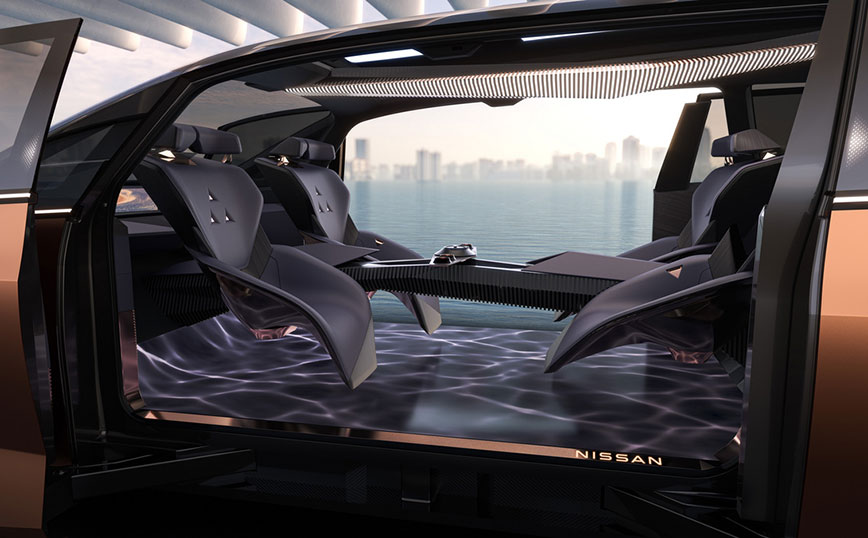 Το εσωτερικό καθίσταται ευρύχωρο χάρη στο EV Technology Vision, το οποίο ενοποιεί εξαρτήματα και μπαταρίες υψηλής ενεργειακής πυκνότητας στερεάς κατάστασης για τη δημιουργία ενός συμπαγούς συνόλου. Το αποτέλεσμα είναι το εξαιρετικά χαμηλό κέντρο βάρους, το οποίο, όταν συνδυάζεται με το προηγμένο σύστημα ελέγχου όλων των τροχών e-4ORCE του οχήματος, παράγει ομαλή και επίπεδη επιτάχυνση και επιβράδυνση. Η κονσόλα και ο φωτισμός διαθέτουν παραδοσιακά ιαπωνικά μοτίβα kumiko και koushiτα οποία δημιουργούν μια αίσθηση πολυτέλειας, ενώ η επίπεδη οθόνη LED στο πάτωμα εμφανίζει εικόνες μιας κοίτης ποταμού και του ουρανού, βοηθώντας στη δημιουργία ενός χαλαρωτικού χώρου όπου το ψηφιακό και η φύση συνδυάζονται.