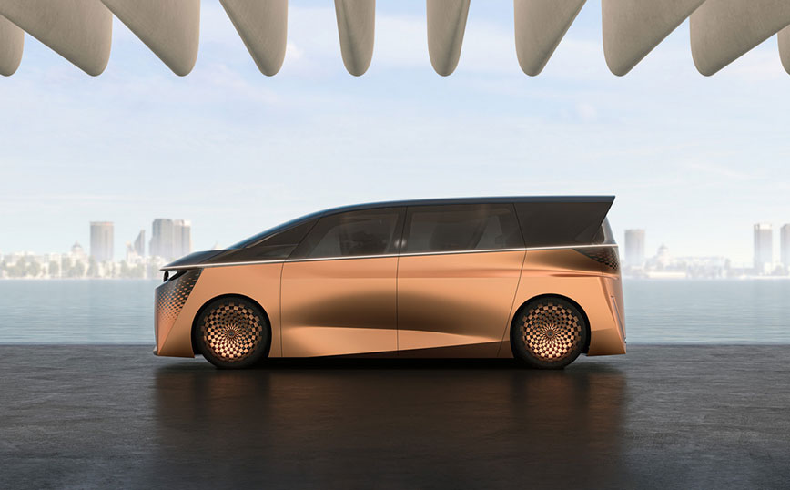 Το εξωτερικό, που μεταφέρει την αίσθηση της άνεσης στο εσωτερικό, αποτελείται από λεία πάνελ αμαξώματος και έντονες χαρακτηριστικές γραμμές που δείχνουν την παραδοσιακή ιαπωνική ομορφιά, ενώ η επιβλητική εμφάνισή του εναρμονίζεται με το γύρω τοπίο. Τα πλαϊνά ρέουν διαγώνια από το μπροστινό προς το πίσω φτερό για υψηλότερη αεροδυναμική απόδοση τονίζοντας την εντύπωση της ομαλής κίνησης που προκύπτει από το συνδυασμό EV και αυτόνομης μετάδοσης κίνησης. Η λευκή γραμμή στο μέσο χρησιμεύει ως προβολέας, ενώ οι ζάντες με μοτίβο kumiko και η απαλή, ευθεία γραμμή του αμαξώματος δημιουργούν μια εξαιρετική αίσθηση πέρα από την κατηγορία του concept.