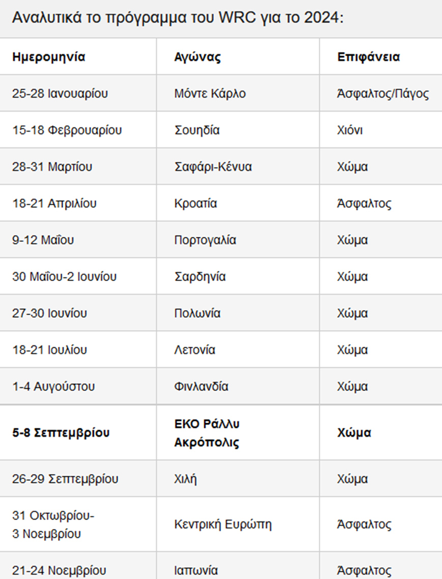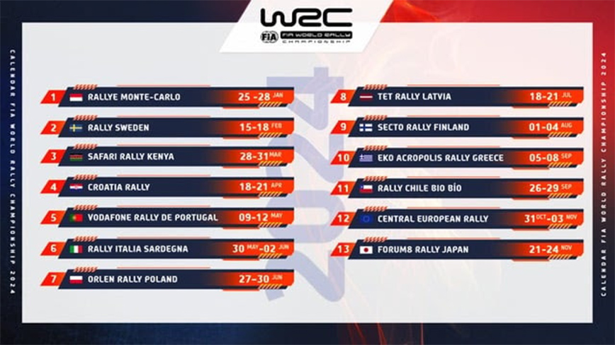 Το ημερολόγιο, που οριστικοποιήθηκε έπειτα από συνεδρίαση του Παγκόσμιου Συμβουλίου της FIA, θα περιλαμβάνει και το 2024 δεκατρείς αγώνες, με τους κλασικούς να πλαισιώνονται και από νέες εισόδους στο Πρωτάθλημα. Σημαντικότερες προσθήκες είναι αυτές του Ράλι Πολωνίας και του Ράλι Λετονίας, ενώ εκτός μένουν Μεξικό και Εσθονία.