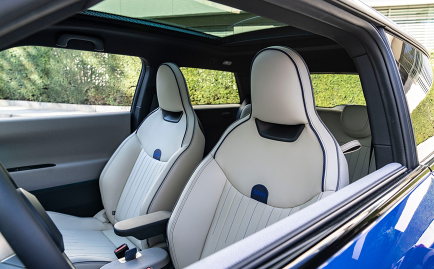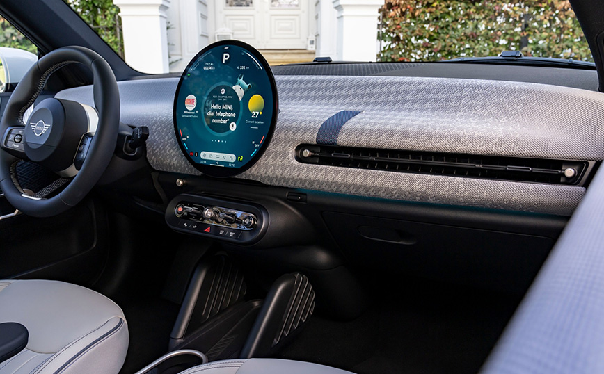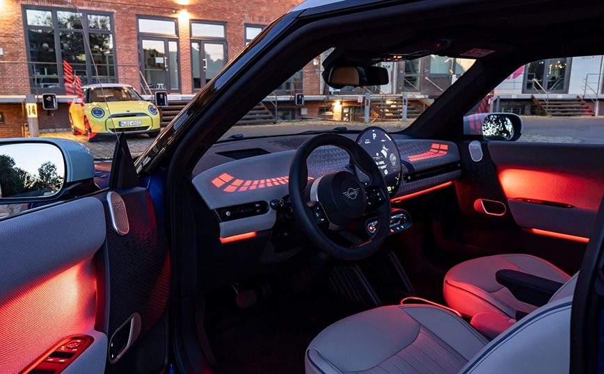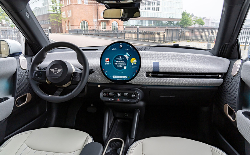 Το νέο μινιμαλιστικό εσωτερικό του Cooper SE εντυπωσιάζει με τα ψηφιακά και φιλικά προς τον χρήστη χαρακτηριστικά του. Λιγότερα εξαρτήματα, τα οποία είναι έξυπνα σχεδιασμένα και εφαρμόζονται με υψηλά πρότυπα, μεταφέρουν με επιτυχία στο παρόν την διάσημη αισθητική του κλασικού Mini. Στο εσωτερικό του νέου Mini κυριαρχούν η στρογγυλή οθόνη OLED, η χαρακτηριστική μπάρα με τους διακόπτες δύο θέσεων και το νέας σχεδίασης τιμόνι. Το κυρτό ταμπλό κοσμείται για πρώτη φορά από υφασμάτινες επιφάνειες και συμβάλλει καθοριστικά στην ατμόσφαιρα ευεξίας του μοντέλου.