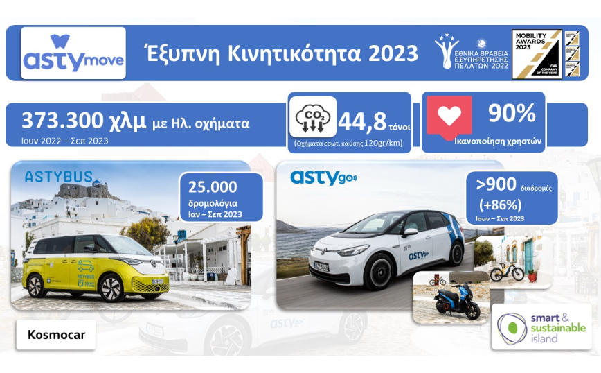 Αντίστοιχα, με την υπηρεσία “astyGO” η οποία πραγματοποιείται με την χρήση των ηλεκτρικών VW ID.3,του eScooter Seat MO 125 και των πανίσχυρων eBikes της Ducati, πραγματοποιήθηκαν πάνω από 895 διαδρομές σημειώνοντας εντυπωσιακή αύξηση +84% σε σχέση με το 2022, με έως και 1,4 χρήστες την ημέρα, ανά όχημα, να το «μοιράζονται», κάνοντας πράξη το μοντέλο του vehicle sharing στην Αστυπάλαια.