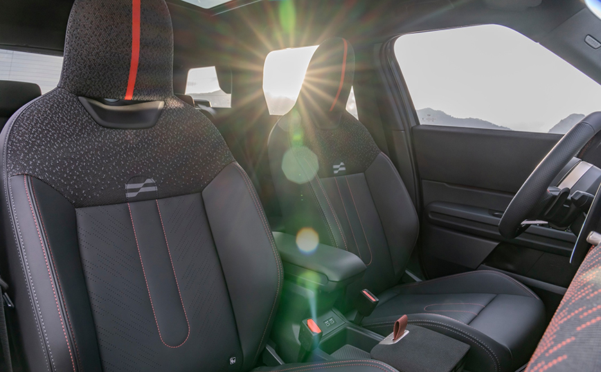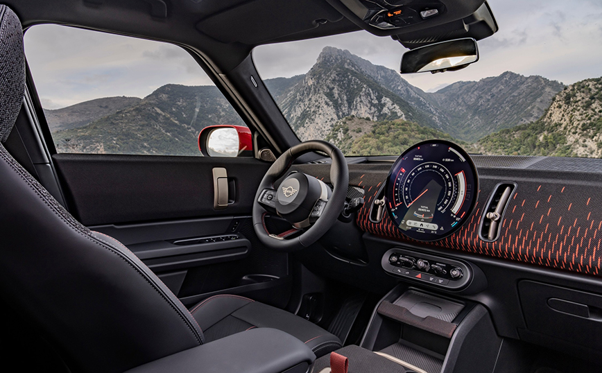 Στο εσωτερικό, η λιτή σχεδιαστική προσέγγιση του John Cooper Works Countryman δημιουργεί μία ιδιαίτερη αίσθηση. Το cockpit χωρίζεται σε δύο τμήματα (άνω και κάτω) με τις κάθετες χειρολαβές θυρών και τους αεραγωγούς να πρωταγωνιστούν στο πρώτο. Αυτό τονίζει το ύψος και το μεγαλύτερο πλάτος του ευρύχωρου crossover. Ο συνδυασμός κόκκινου-μαύρου στο ταμπλό, κατά μήκος των πάνελ των θυρών και στα υψηλής ποιότητας σπορ καθίσματα JCW, είναι μια αναφορά στην αγωνιστική κληρονομιά της μάρκας, ενώ το ταμπλό κοσμείται από δίχρωμο ύφασμα από ανακυκλωμένο πολυεστέρα.