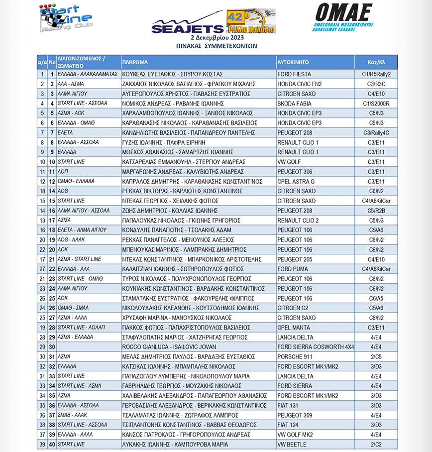 Στον αγώνα που θα ξεκινήσει στις 10:30 το πρωί του Σαββάτου από την πλατεία Γκλιάτη της Μάνδρας (όπου και ο τερματισμός στις 15:25), δήλωσαν συμμετοχή 39 πληρώματα, πολλά των οποίων θα οδηγήσουν αυτοκίνητα ιστορικού ενδιαφέροντος (ηλικίας 30+ ετών).