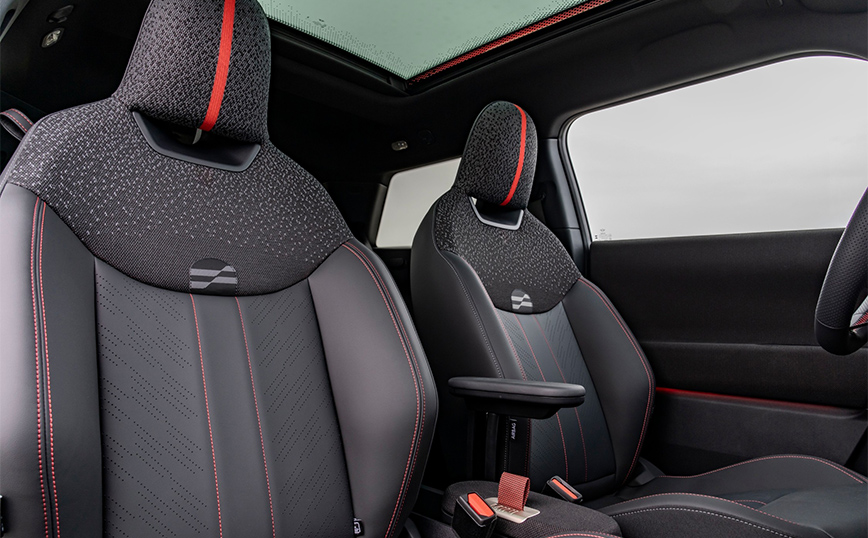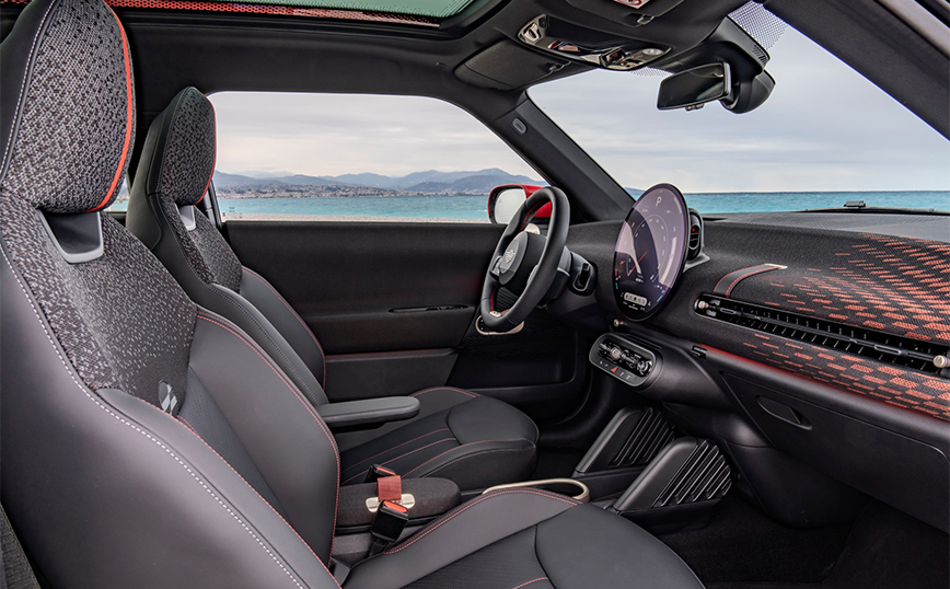 Τα καθίσματα JCW συνδυάζουν συνθετικό δέρμα με κόκκινες ραφές και πολύχρωμο πλεκτό ύφασμα στην περιοχή των ώμων. Η φιλοσοφία μαύρου και κόκκινου συνεχίζεται στην 2d πλεκτή επένδυση στα πάνελ των θυρών και στο ταμπλό. Η πλευρά του συνοδηγού κοσμείται με το ειδικό μοτίβο σε στυλ καρό σημαίας. Η κεντρική, υψηλής ανάλυσης οθόνη OLED με διάμετρο 240 χλστ ομαδοποιεί δεδομένα του οχήματος και προβάλλει πληροφορίες για λειτουργίες πλοήγησης, πολυμέσων, τηλεφώνου και ρυθμίσεις του συστήματος κλιματισμού. Τα Mini Experience Modes προσφέρουν νέες δυνατότητες εξατομίκευσης. Μεταξύ άλλων, το εμπνευσμένο από την John Cooper Works, Go-Kart Mode, χρωματίζουν την οθόνη και τον εσωτερικό φωτισμό σε ανθρακί κόκκινο. Εκτός από τον ειδικό ήχο Go-Kart, η βελτιστοποιημένη απόκριση του πεντάλ του γκαζιού επιτείνει τη σπορ οδηγική εμπειρία.