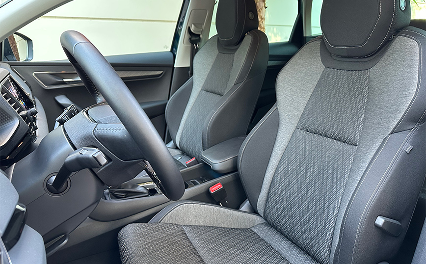 Οδηγός και συνοδηγός κάθονται σε ανατομικά καθίσματα με επαρκή πλευρική στήριξη και απρόσκοπτη ορατότητα χάρη στην αποφυγή σχεδιαστικών ακροτήτων στο αμάξωμα.