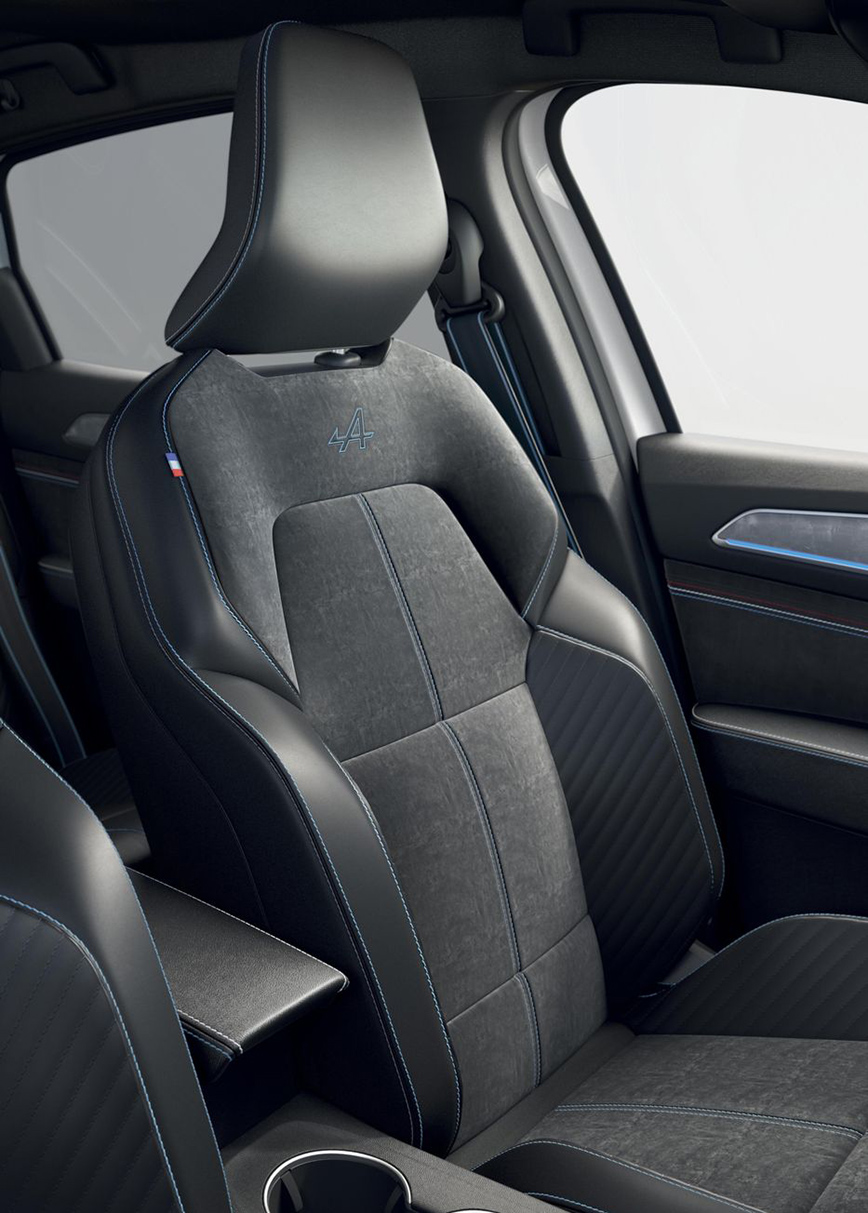 Στο εσωτερικό, τα καθίσματα είναι ένα μείγμα από EcoTep (10% υλικά βιολογικής προέλευσης) και συνθετικό σουέντ. Τα καθίσματα διαθέτουν πλέον μπλε οριζόντιες ραφές και το λογότυπο Alpine στην πλάτη, όπως και οι ζώνες ασφαλείας με τις δύο μπλε ρίγες.