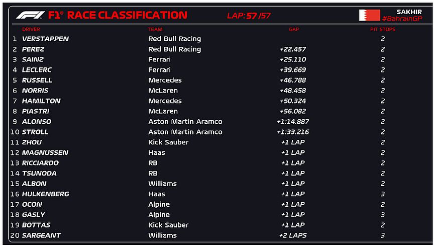 Έτσι, ο Μαξ Φερστάπεν έφτασε με χαρακτηριστική άνεση και με το γνωστό του κυριαρχικό στιλ στην πρώτη του φετινή νίκη, που είναι η 55η της καριέρας του. Ο Πέρεζ ολοκλήρωσε το μαγικό βράδυ για τη Red Bull με τη 2η θέση και ο Κάρλος Σάινθ πήρε μια πολύ σημαντική 3η θέση και ανέβηκε στο βάθρο. Ακολούθησαν οι Λεκλέρ, Ράσελ, Νόρις, Χάμιλτον, Πιάστρι, Αλόνσο και Στρολ.