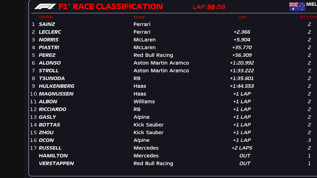 Στον τρίτο φετινό αγώνα της Formula 1, το Grand Prix Αυστραλίας, είχαμε έναν νέο νικητή. Ο Κάρλος Σάινθ εκμεταλλεύτηκε την ταχύτητα της Ferrari και την εγκατάλειψη του Φερστάπεν και πήρε μια μεγάλη νίκη, την τρίτη στην καριέρα του, μπροστά από τον Σαρλ Λεκλέρ, με τη Scuderia Ferrari να κάνει ένα ανέλπιστο 1-2. O Λάντο Νόρις της McLaren συμπλήρωσε το βάθρο με την 3η θέση στον αγώνα.
