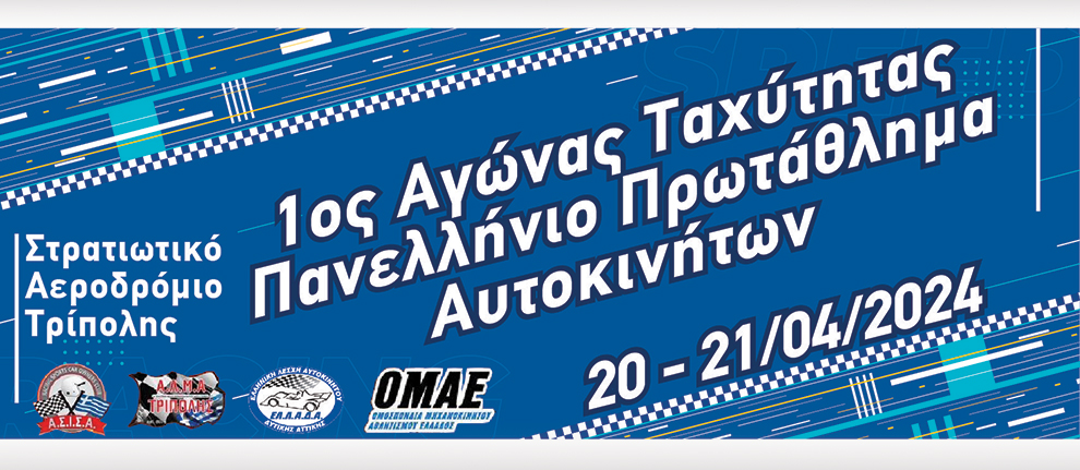 Το Πανελλήνιο Πρωτάθλημα Ταχύτητας του 2024 ξεκινά στις 20-21 Απριλίου επιστρέφοντας μετά από χρόνια στο Στρατιωτικό Αεροδρόμιο της Τρίπολης. Ο πρώτος γύρος του θεσμού αναμένεται να προσελκύσει πλήθος αγωνιζόμενων, οι οποίοι ανυπομονούν για την επανέναρξή του. Διοργανωτές είναι τα Σωματεία Αγωνιστικός Σύλλογος Ιδιοκτητών Σπορ αυτοκινήτων (ΑΣΙΣΑ) και «Ελληνική Λέσχη Αυτοκινήτου Δυτικής Αττικής» (ΕΛ.Λ.Α.Δ.Α.).