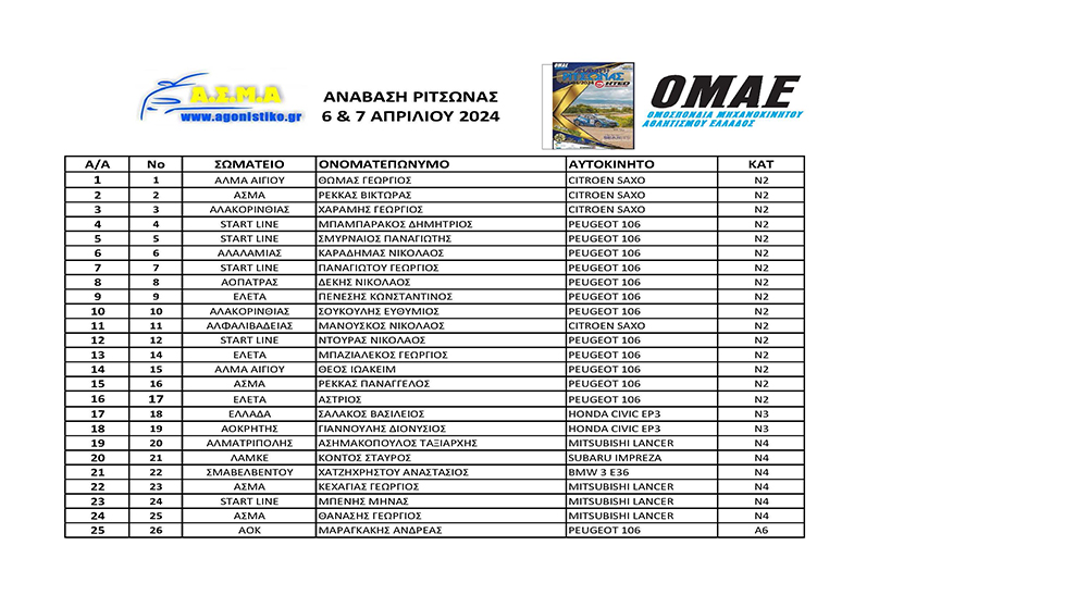 Με τον καλύτερο τρόπο ξεκινά η χρονιά στο Πανελλήνιο Πρωτάθλημα Αναβάσεων, καθώς 101 οδηγοί θα ριχτούν στη μάχη με το χρόνο στον εναρκτήριο αγώνα της χρονιάς. Την ευθύνη της οργάνωσης έχει αναλάβει το Αγωνιστικό Σωματείο Μηχανοκίνητου Αθλητισμού (Α.Σ.Μ.Α.). Στο πλευρό των οργανωτών βρίσκεται η Γενική Γραμματεία Αθλητισμού (Γ.Γ.Α.), η Περιφέρεια Στερεάς Ελλάδας και ο Δήμος Χαλκιδέων, που στηρίζουν έμπρακτα το σημαντικό αυτό γεγονός για την ευρύτερη περιοχή της Χαλκίδας, ενώ και το STAR Κεντρικής Ελλάδας θα δώσει το παρών σε άλλη μία Ανάβαση Ριτσώνας.