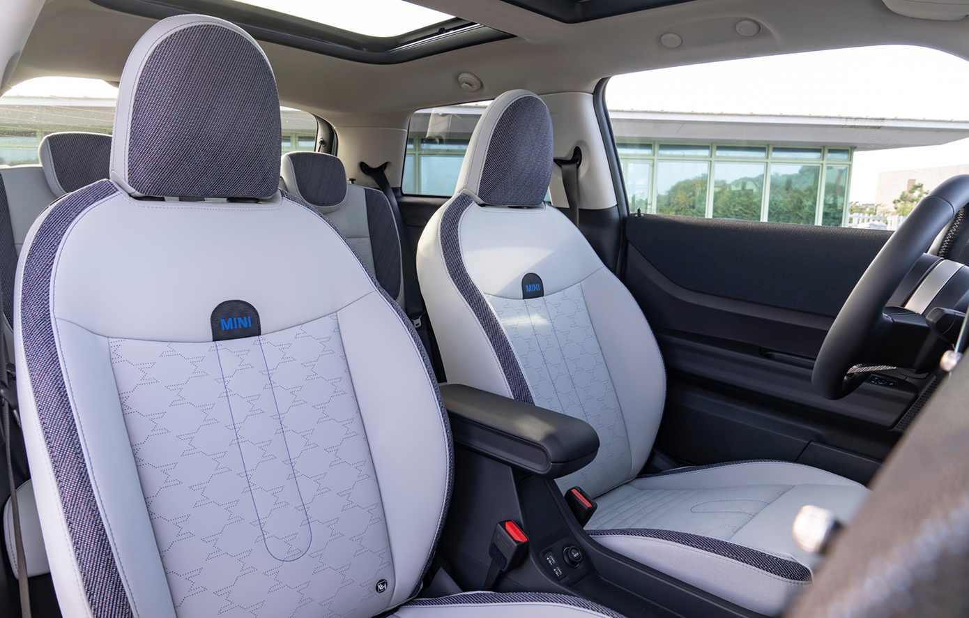 Τα υψηλής ποιότητας καθίσματα Vescin σε γκρι ή μαύρο χρώμα σχηματίζουν μια εντυπωσιακή αντίθεση. Το διάτρητο μοτίβο houndstooth στην πλάτη και το κάθισμα, καθώς και οι μπλε ραφές και τα υφασμάτινα ένθετα, με σχέδια στα πλαϊνά, τονίζουν τον κομψό σχεδιασμό του εσωτερικού.