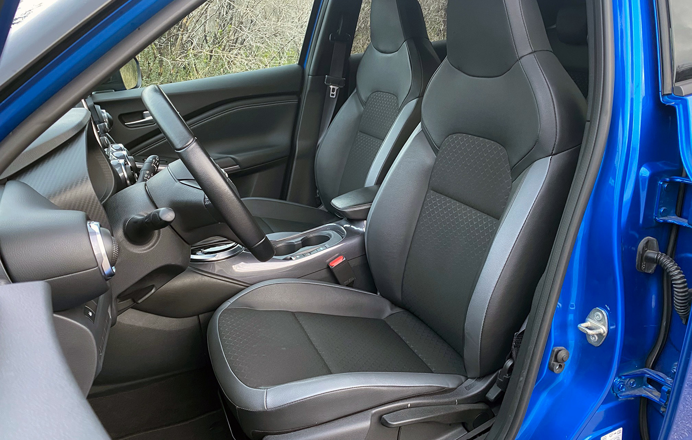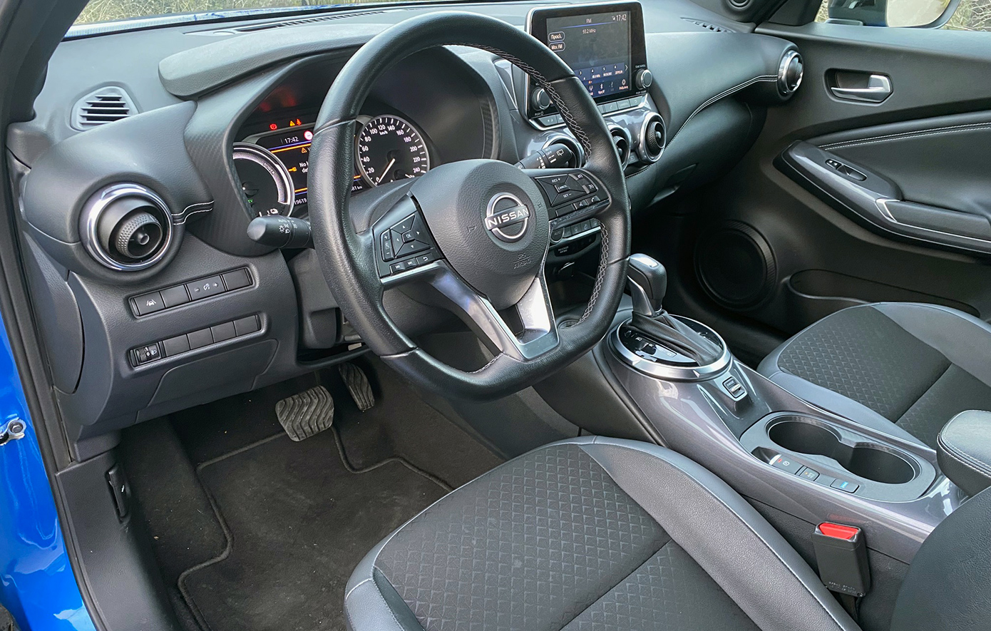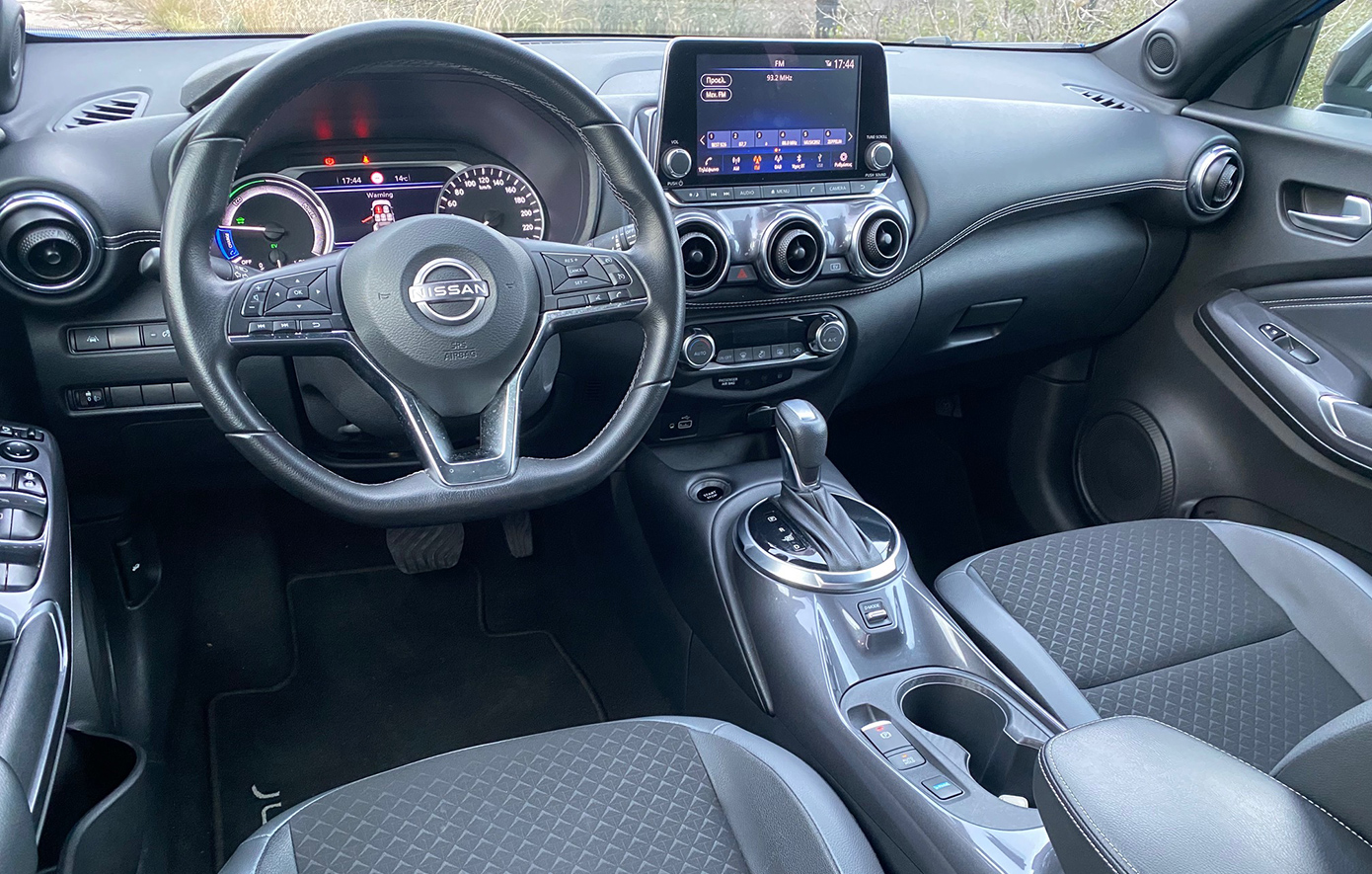Εξωτερικά, το υβριδικό Juke έχει δυσδιάκριτες διαφορές από το «απλό» που εντοπίζονται στην μάσκα (ανοιγοκλείνουν οι γρίλιες), στην πίσω αεροτομή και στα αεροδυναμικά βοηθήματα εμπρός από τους μπροστινούς τροχούς. Όλα αυτά καταφέρνουν να μειώσουν κατά 2 γραμμάρια τις εκπομπές CO2. Στο ευρύχωρο (για την κατηγορία) και εμφανώς ποιοτικό εσωτερικό οι διαφορές εντοπίζονται κυρίως στον πίνακα των οργάνων, όπου στη θέση του στροφόμετρου είναι πλέον ένα όργανο που ενημερώνει για την κατανάλωση ενέργειας την ώρα της κίνησης του οχήματος, με τρεις τομείς όπου στο charge φορτίζει η μπαταρία, στο Eco κινείσαι ως επί το πλείστον ηλεκτρικά (ανάβει και η φωτεινή ένδειξη EV) και στο power καταναλώνεις κυρίως καύσιμο με τη βοήθεια του ρεύματος.