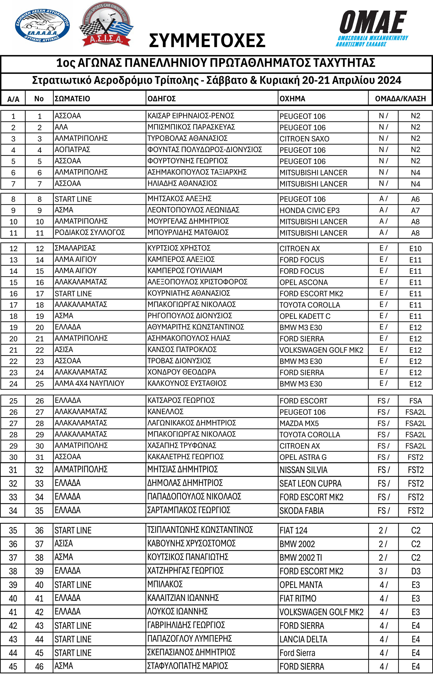 Ο αγώνας έχει ώρα εκκίνησης 11:30 για τις Κατηγορίες Ν&Α και θα ακολουθήσουν οι κατηγορίες Ε, Ιστορικών και Formula Saloon.