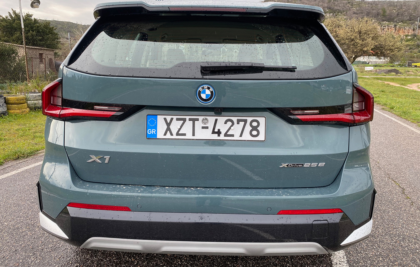 Η διαφορά από τις «απλές» Χ1 εντοπίζεται σε μια θυρίδα που βρίσκεται στο πάνω μέρος του εμπρός αριστερού φτερού, κάτω από την οποία βρίσκεται η είσοδος για την τροφοδοσία με ρεύμα της μπαταρίας ιόντων λιθίου χωρητικότητας 16,3 KWh (ωφέλιμη χωρητικότητα 14,2 KWh), η οποία τροφοδοτεί ένα ηλεκτροκινητήρα που βρίσκεται στο πίσω μέρος του όμορφου αμαξώματος. Η κινητήρια διάταξη του μοντέλου αναγράφεται στην 5η πόρτα με την ένδειξη xDrive25e, όπου φανερώνεται και η τετρακίνηση.
