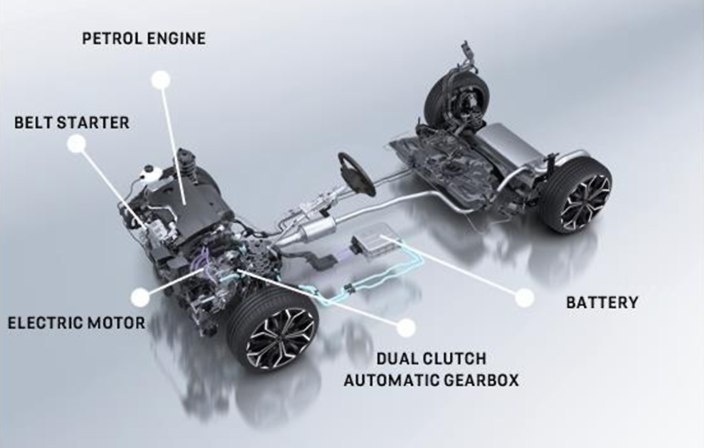 Ο σύγχρονος ηλεκτροκινητήρας μόνιμου μαγνήτη, είναι ενσωματωμένος στο νέο κιβώτιο διπλού συμπλέκτη έξι σχέσεων e-DCS6. Με 28 ίππους και μέγιστη ροπή 55 Nm, μπορεί να λειτουργεί αποκλειστικά με ηλεκτρική ενέργεια υπό μέτρια φορτία, χωρίς υποβοήθηση από τον κινητήρα εσωτερικής καύσης. Κατά την επιβράδυνση, ο ηλεκτροκινητήρας λειτουργεί ως γεννήτρια για την ανάκτηση κινητικής ενέργειας και την τροφοδοσία της μπαταρίας, παρέχοντας ταυτόχρονα ενέργεια για την εκκίνηση του βενζινοκινητήρα.