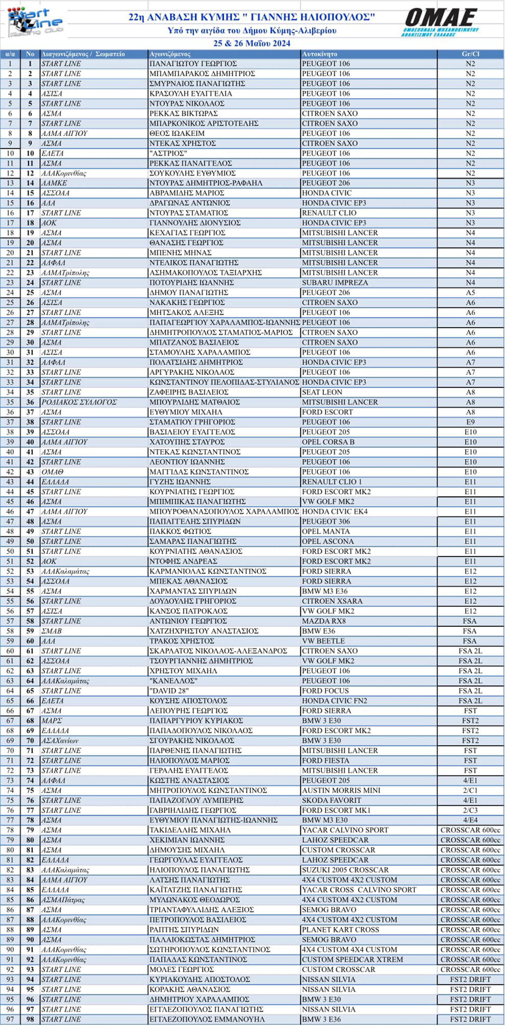 Περνώντας στο αγωνιστικό κομμάτι, που είναι και το πιο σημαντικό, οι φετινές συμμετοχές έφτασαν τις 97 και διακρίνονται για την ποιότητά τους σε όλες τις Ομάδες και Κλάσεις. Με αυτόν τον τρόπο οι πρωταγωνιστές του θεσμού για ακόμη μία χρονιά έδειξαν με τον καλύτερο τρόπο πως αγαπούν την Ανάβαση Κύμης.