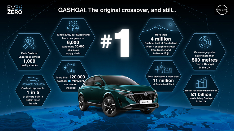 Το ανανεωμένο Qashqai μπήκε στην παραγωγή καθώς η Nissan συνεχίζει να αναπτύσσει το EV36 Zero όραμά της στο Sunderland, ένα σχέδιο για το μέλλον της αυτοκινητοβιομηχανίας, συνδυάζοντας την κατασκευή ηλεκτρικών οχημάτων και την παραγωγή μπαταριών, που τροφοδοτούνται από ανανεώσιμες πηγές ενέργειας.