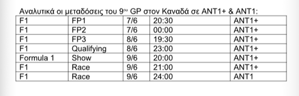 Αναλυτικά οι μεταδόσεις του 9ου GP στον Καναδά σε ΑΝΤ1+ & ΑΝΤ1: