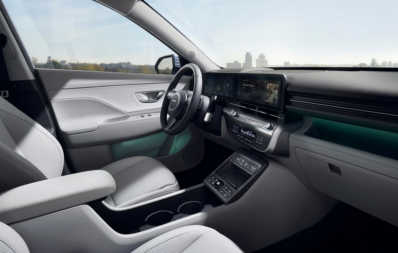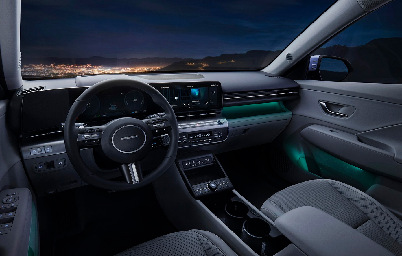 Το εσωτερικό του είναι σχεδιασμένο με γνώμονα την άνεση και την ευελιξία, που αποτελούν τα ιδανικά χαρακτηριστικά για ένα σύγχρονο lifestyle. Χάρη στις αναβαθμισμένες διαστάσεις του μοντέλου και την καινοτόμο αρχιτεκτονική που προέρχεται από το KONA EV, η Hyundai σχεδίασε έναν μεγαλύτερο «χώρο διαβίωσης». Το οδηγοκεντρικό ταμπλό τονίζεται από ένα αιωρούμενο οριζόντιο C-Pad με ενσωματωμένες τις διπλές οθόνες 12,3 ιντσών που υπογραμμίζουν τον high-tech χαρακτήρα του νέου KONA. Επιπλέον, ο επιλογέας ταχυτήτων shift-by-wire έχει μεταφερθεί πλέον από την κεντρική κονσόλα στην κολόνα του τιμονιού, επιτρέποντας περισσότερο χώρο αποθήκευσης στην κονσόλα.