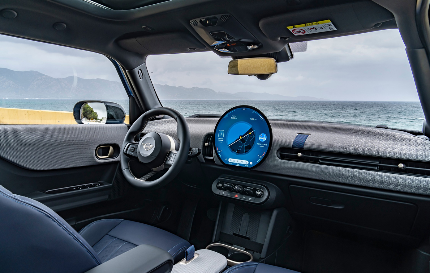Το cockpit του νέου 5θυρου Cooper θυμίζει την σχεδιαστική φιλοσοφία του κλασικού Mini. Με τη στρογγυλή οθόνη OLED, όλες οι λειτουργίες του οχήματος μπορούν να ελέγχονται με την αφή ή με φωνητικές εντολής. Στην επάνω περιοχή της οθόνης εμφανίζονται πληροφορίες που σχετίζονται με το όχημα, ενώ στο κάτω μέρος μπορούν να επιλέγονται απευθείας τα στοιχεία μενού Navigation, Media, Telephone και Climate.