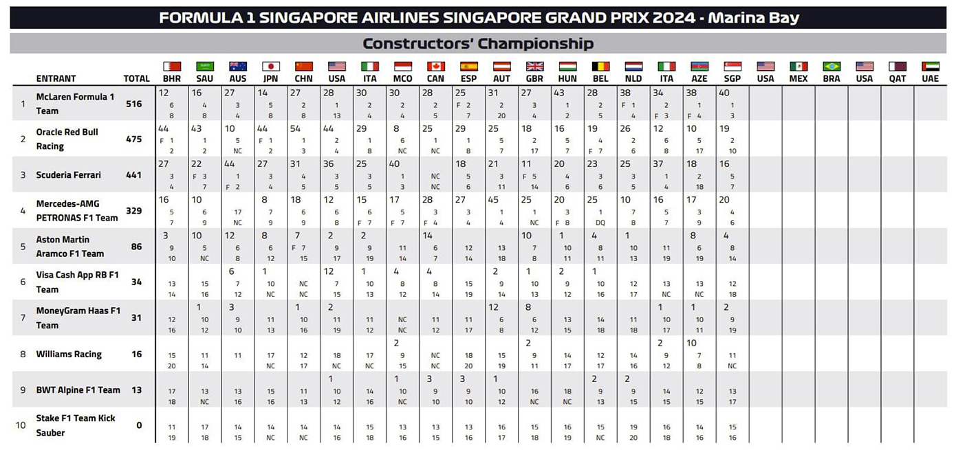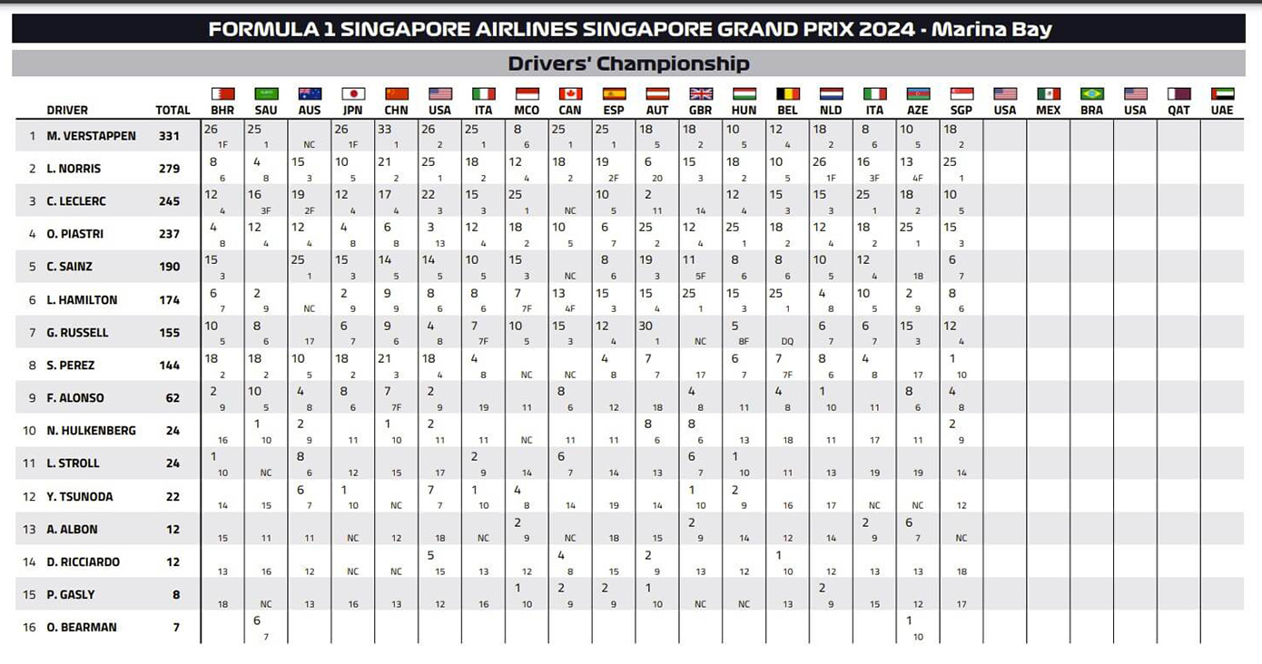 Η τελική κατάταξη του 18ου Grand Prix στη Σιγκαπούρη έχει ως εξής: