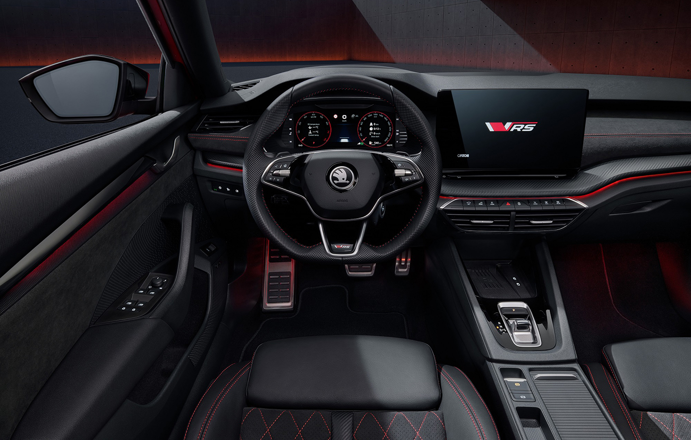Εκτός από τα νέα και βιώσιμα υλικά για τα καθίσματα, το ταμπλό και τις επενδύσεις των πορτών, ο ψηφιακός πίνακας οργάνων 10ιντσών αποτελεί βασικό εξοπλισμό, ενώ το Virtual Cockpit 10 ιντσών με βελτιωμένη λειτουργικότητα εξοπλίσει τις μεγαλύτερες εκδόσεις Sportline & RS. Διαθέσιμο προαιρετικά παραμένει το head-up display. Και οι δύο εκδόσεις του ψηφιακού πίνακα οργάνων διαθέτουν ανασχεδιασμένα γραφικά, όπως και οι οθόνες infotainment. Μια οθόνη infotainment 13 ιντσών διατίθεται προαιρετικά, ενώ η οθόνη infotainment 10 ιντσών περιλαμβάνεται στον βασικό εξοπλισμό. Η ανανεωμένη Octavia διαθέτει πλέον επίσης ένα Phone Box με πιο ισχυρή φόρτιση έως 15 Watt και αερισμό, καθώς και τέσσερις θύρες USB-C ταχείας φόρτισης με παροχή ισχύος έως 45 Watt. Η θύρα USB-C 15 Watt στο πίσω μέρος του εσωτερικού καθρέφτη αποτελεί βασικό εξοπλισμό από το επίπεδο εξοπλισμού Selection και πάνω. Το βασιζόμενο σε τεχνητή νοημοσύνη chatbot ChatGPT, θα ενσωματωθεί αργότερα στη φωνητική βοηθό Laura ως βασικός εξοπλισμός, εισάγοντας μια ποικιλία νέων δυνατοτήτων που ξεπερνούν κατά πολύ τις προηγούμενες φωνητικές εντολές. Επίσης, το Intelligent ParkAssist (έξυπνη υποβοήθηση στάθμευσης) κάνει επίσης την πρώτη εμφάνισή του στην Octavia.