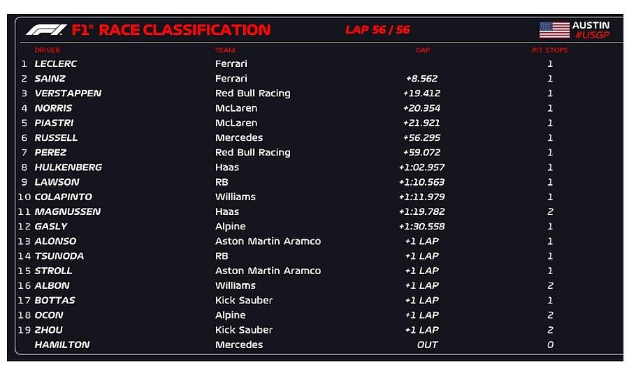 Την τρίτη του φετινή νίκη και την τέταρτη της Ferrari κατάφερε να σημειώσει ο Σαρλ Λεκλέρκ στο Grand Prix της Formula 1 στο Οστιν του Τέξας.